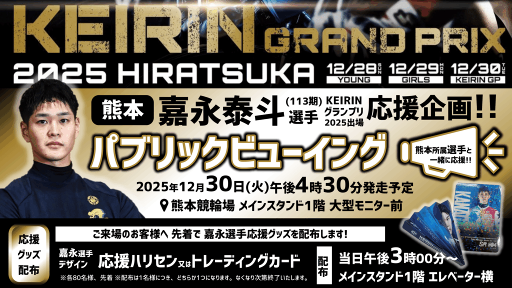 競輪最高峰「KEIRINグランプリ2025」へ出場する嘉永泰斗選手(熊本・113期)を応援する為、熊本競輪場ではパブリックビューイングを開催します。