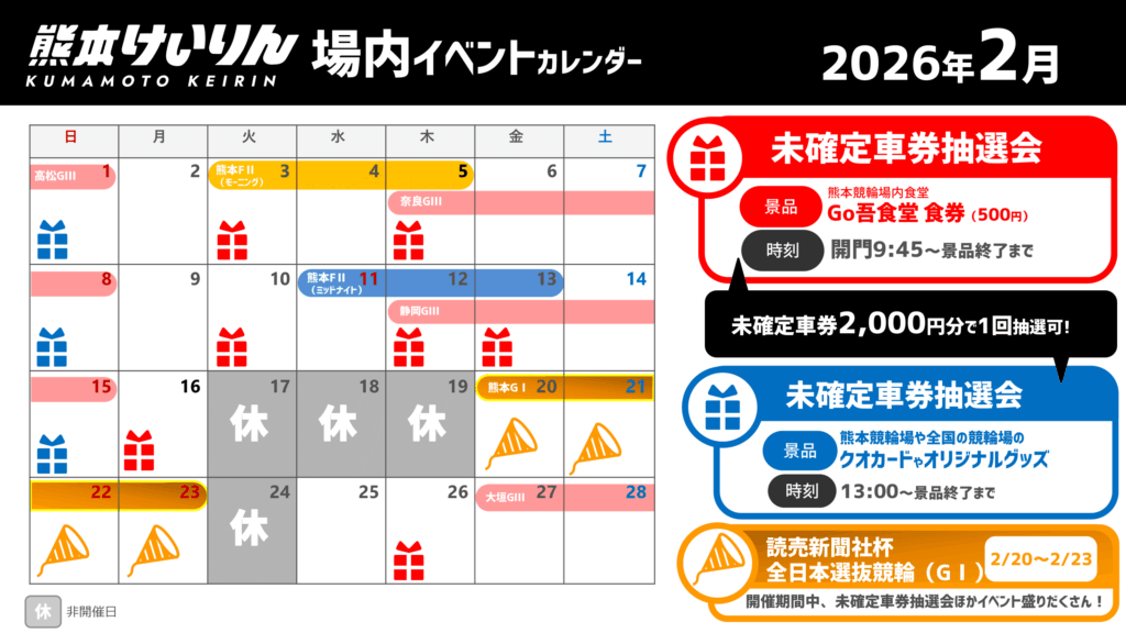 - 熊本競輪場で購入した未確定車券2,000円分で1回抽選可