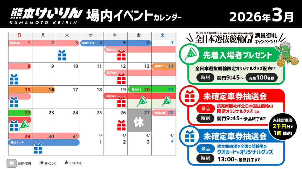 熊本競輪場では、クオカードやグッズが抽選であたるお楽しみ抽選会等、定期的にイベントを開催中です。熊本競輪場へのご来場者様だけの特典です!是非、熊本けいりんに足をお運びください♪