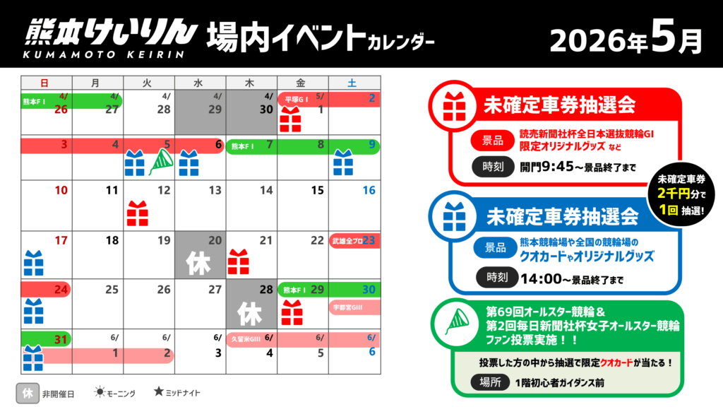 熊本競輪場では、クオカードやグッズが抽選であたるお楽しみ抽選会等、定期的にイベントを開催中です。熊本競輪場へのご来場者様だけの特典です!是非、熊本けいりんに足をお運びください♪