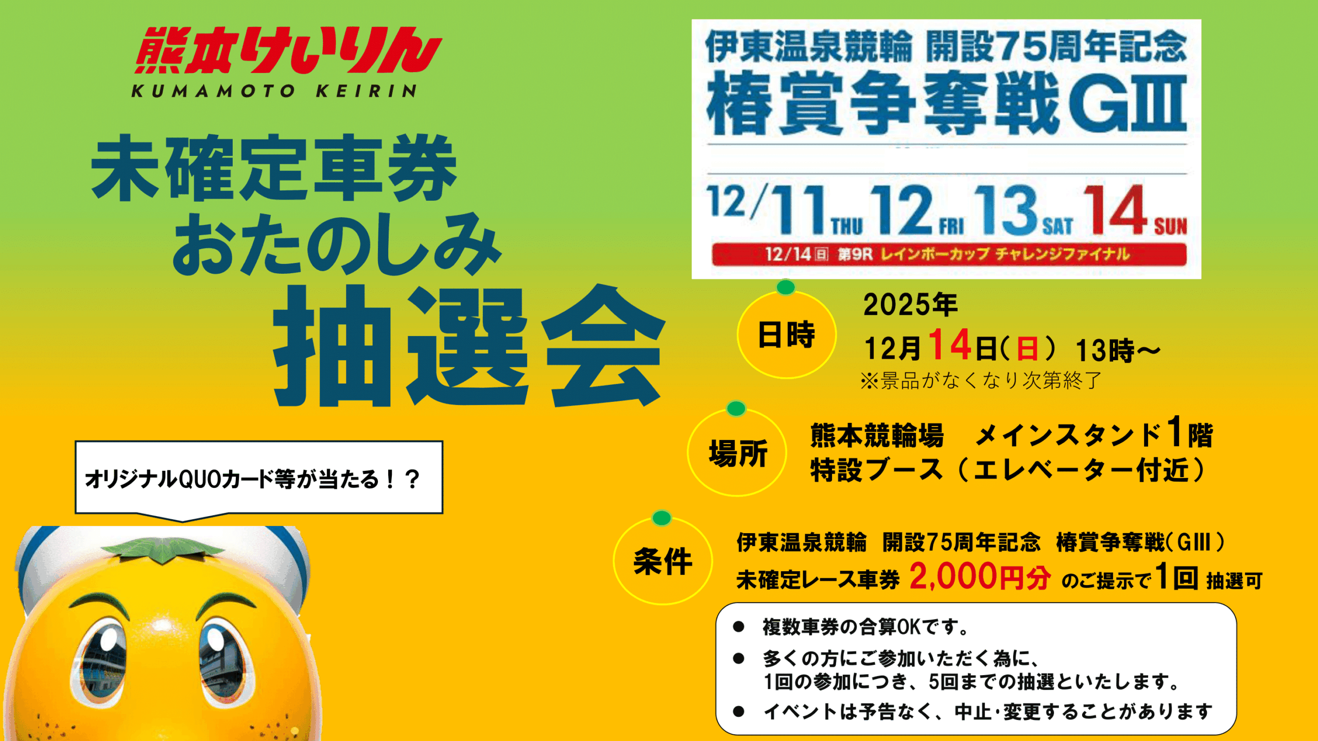 令和7年(2025年)12月11日(木)~14日(日)、伊東温泉競輪「開設75周年記念椿賞争奪戦GⅢ」の開催に伴い、未確定車券おたのしみ抽選会を開催します!