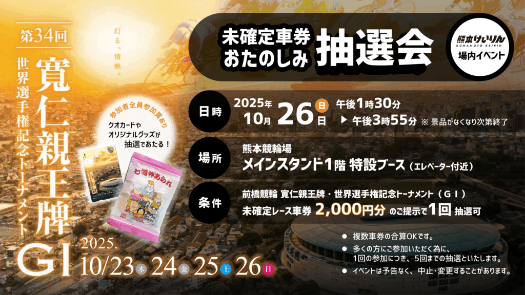 令和7年(2025年)10月23日(木)~26日(日)、前橋競輪「第34回寬仁親王牌・世界選手権記念トーナメント」(GⅠ)の開催に伴い、未確定車券おたのしみ抽選会を開催します!