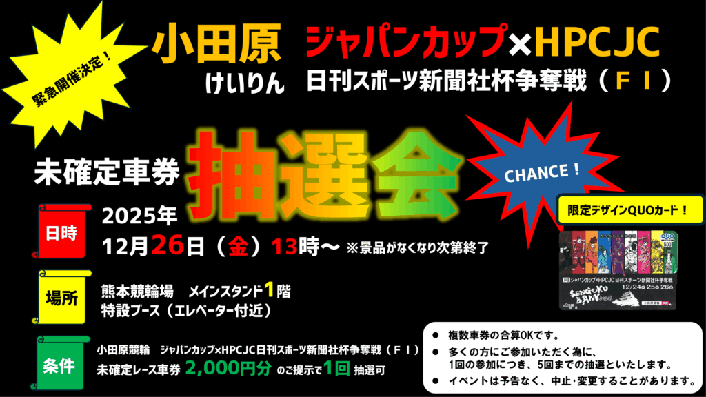 【場内イベント|12/26㈮】未確定車券抽選会【小田原競輪|ジャパンカップ×HPCJC 日刊スポーツ新聞社杯争奪戦(FⅠ)】