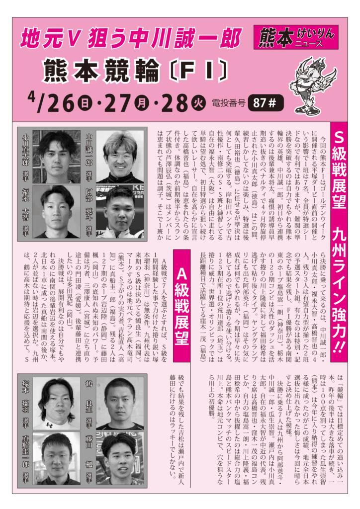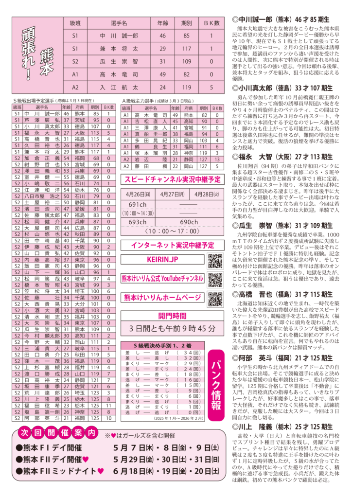 2026.04.16 発売レース情報ピックアップ 【熊本市営競輪】情報誌「トータリゼータエンジニアリング熊本杯」(FⅠ・デイ) 情報誌【熊本市営競輪】「トータリゼータエンジニアリング熊本杯」(FⅠ・デイ)ダウンロード