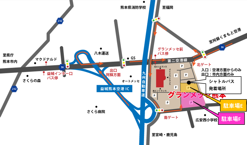 期間中、グランメッセ熊本(〒861-2235 熊本県上益城郡益城町福富1010)の駐車場E・Fを臨時駐車場としてご利用いただけます。無料シャトルバスでのパークアンドライドでお越しください。